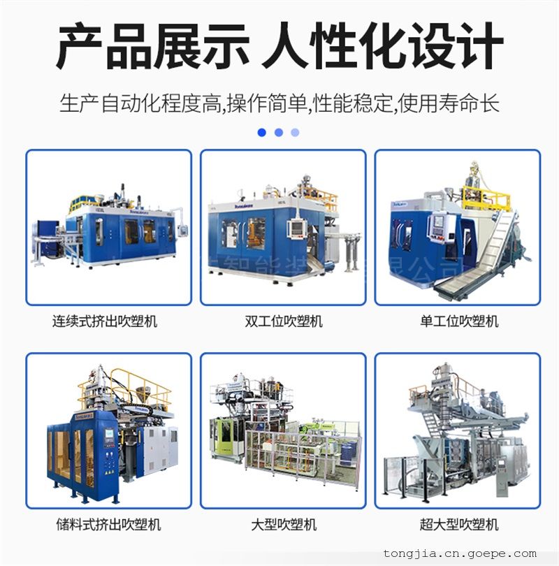 品牌:通佳 型号:TJ 适用原料:PE 产品别名:吹塑机 产品用途:塑料桶生产设备 电动机功率:110 kw 外形尺寸:标准 mm 重量:180000 应用领域:塑料编织行业;工业厂房;汽车;家具业;家电业;建筑业;五金业;门业 山东通佳是国内大型吹塑机生产厂家,主要生产各类大小型号的吹塑机,各类塑料化工桶吹塑机生产设备,真实漆桶吹塑机生产设备机器,各类中空异形件吹塑机生产设备,更多关于吹塑机价格,吹塑机型号 山东通佳是国内大型塑料设备生产集团,旗下拥有目前位居国内首位的中空吹塑机生产车间,生产的超大型系列中空吹塑机也成为了国内首创,可生产设备规格型号齐全,设备产品更是涵盖了多种市场种类,除可生产各类机油桶,洗衣液桶,尿素溶液桶,化工桶类,还可生产各类中大型民用水桶水塔,吨桶,更可生产安全座椅,工具箱,玩具,汽车风管,汽车油箱,汽车尾翼,皮划艇等各类中空产品,设备采用全自动伺服节能控制系统,全进口液压阀,超高的配置,超高的性价比,山东通佳欢迎广大客户前来考察,咨询!